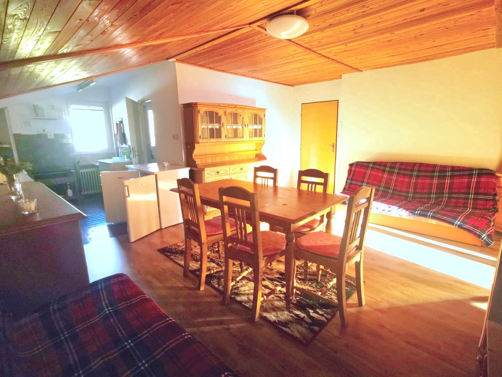 Obývací pokoj s jídelním stolem a kuchyňským koutem, lednice, vařič, mikrovlnná trouba.