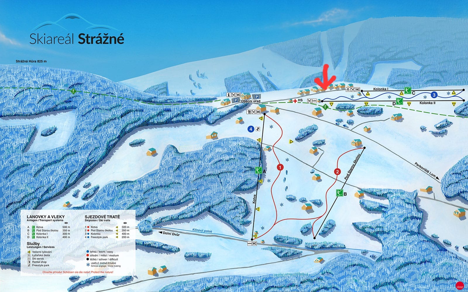např.: lyžařské vleky, běžecké tratě, půjčovny lyží, lyžařské školičky, restaurace, bistra, dětské hřiště, tenisové kurty, poštu, autobusovou zastávku, prodejnu potravin a pod.